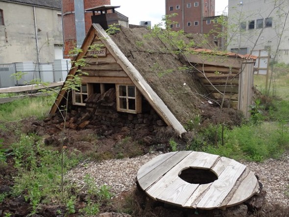 Op het terrein van een voormalige strokartonfabriek de evocatie van een plaggenhut. Een deel van de ‘voorgevel’, die bestaat uit turf, is naar buiten gestort: