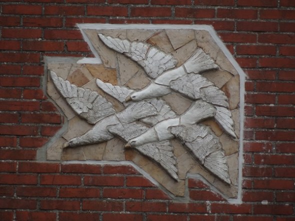 In de voorgevel van diezelfde oude strokartonfabriek zitten nu drie werkjes van Anno Smith, waaronder dit mozaïek van een vlucht ganzen: