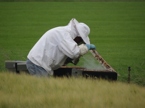 Tussen Blijham en Vriescheloo berookt een imker een van zijn vier bijenvolken: