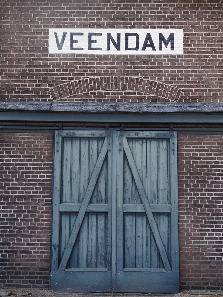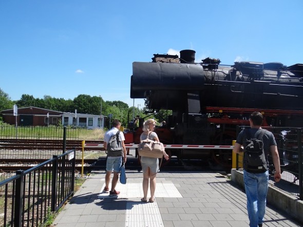 Station Veendam. Bij de spoorwegovergang passeert net een Duitse loc van de museumspoorlijn STAR,  die, naar ik hoorde, ook passagiers met fietsen vervoert, zodat je vanuit Stadskanaal heel mooi Westerwolde afpeddelen kunt: