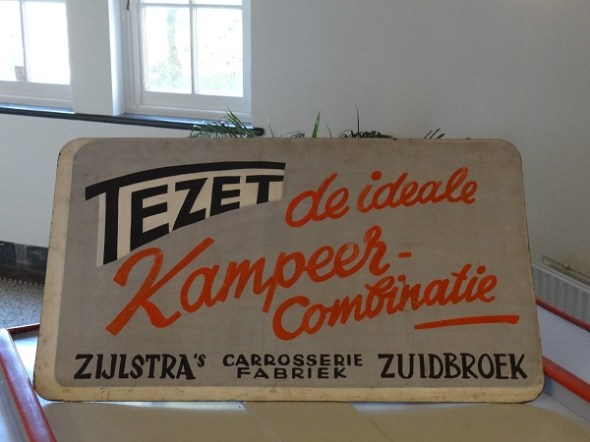 De samensteller van de expositie, Fred Ootjers, ontdekte dat er in Oost-Groningen destijds ettelijke caravan- en vouwwagenbouwers zaten. Reclame voor het merk Tezet, uit Zijlstra’s carrosseriefabriek in Zuidbroek: