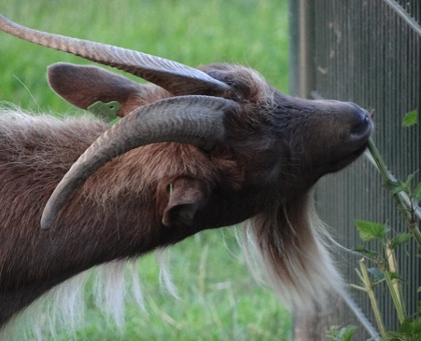 Landgeitebok bij kinderboerderij Minerva knabbbelt aan een schier onbereikbaar en daarmee buitengewoon appetijtelijk blaadje: