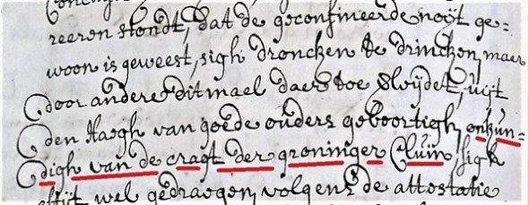 Hun cliënt, een adelborst en dus een jonge officier in opleiding, was weliswaar flink tekeer gegaan met het breken van glazen in de Raamstraat, maar daarvoor waren verzachtende omstandigheden aanwezig, vonden ze. Het ging immers om een jongen uit een goed Haags milieu en hij dronk zich nooit dronken. Maar nu hadden slechte vrienden hem daartoe overgehaald, en “onkundigh van de cragt der Groninger Cluin”, was hij de beest uit gaan hangen.