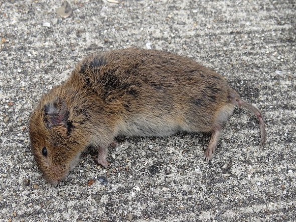 Dode veldmuis op het fietspad tussen het Aduarderdiep achter Oostum en de Feerwerdermeeden – er zat een klein bruin vogeltje op in te pikken, dat prompt wegvloog toen ik stilstond. Het oor van de muis is al weg: