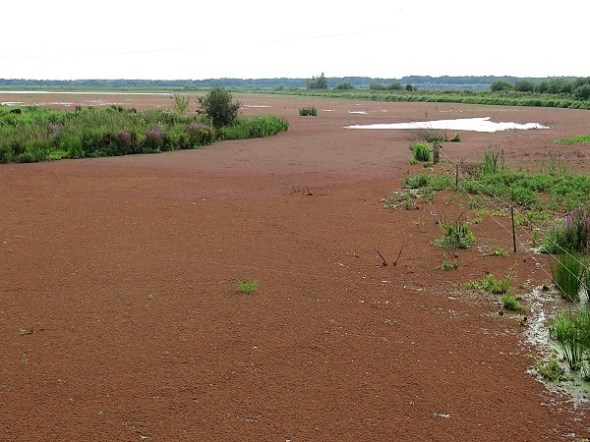 Het kennelijk nogal voedselrijke water kleurt rood van de grote kroosvaren: