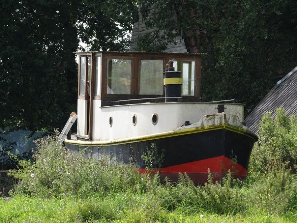 Iemand in Noordlaren heeft dit Kappie-achtige sleepbootje naast zijn boerderij staan. Gezien het trappetje zal het wel worden opgeknapt: