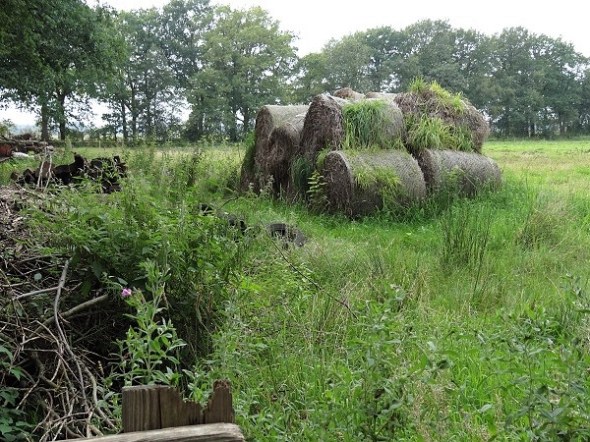 Bij Natuurmonumenten aan de Onlander kant van Eelde ligt een terrein waar rollen hooi overgroeid raken met gras. Altijd een merkwaardig gezicht, zoiets: