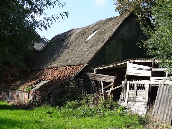 De reden dat boeren schuren in vervallen staat vaak verder laten vervallen en niet afbreken is tweeledig. A: de grond waarop de vervallen schuur staat is nog niet voor iets anders nodig en B: het laten afbreken van de schuur is kostbaar, als hij vanzelf in elkaar stort komen alleen de afvoerkosten van het puin voor rekening van de eigenaar(huurder?). die zijn er ook bij afbraak, maar het scheelt minstens een slok op een borrel. Als je de boel uit zichzelf laat instorten hoef je ook niet allerlei langdurige procedures om vergunningen te verkrijgen aan te gaan. Ook bij boeren gaat het verstand vaak voorop, al lijkt zo’n vervallen schuur natuurlijk nergens op. (Wel fotogeniek trouwens). Reina