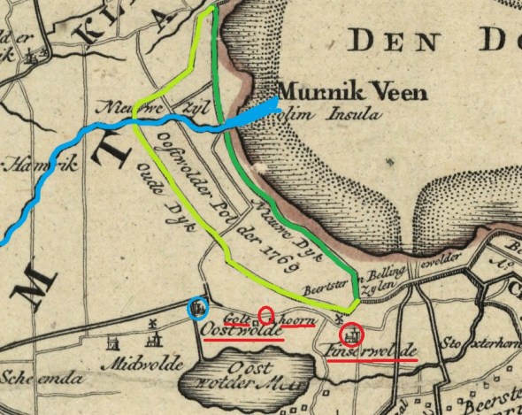 De Oostwolderpolder op een kaart uit 1791. Donkergroen de nieuwe dijk van 1769, lichtgroen die van 1701, blauw de Olde Geut, rood de voornaamste plaatsen. Bron: RHC Groninger Archieven 817-836.