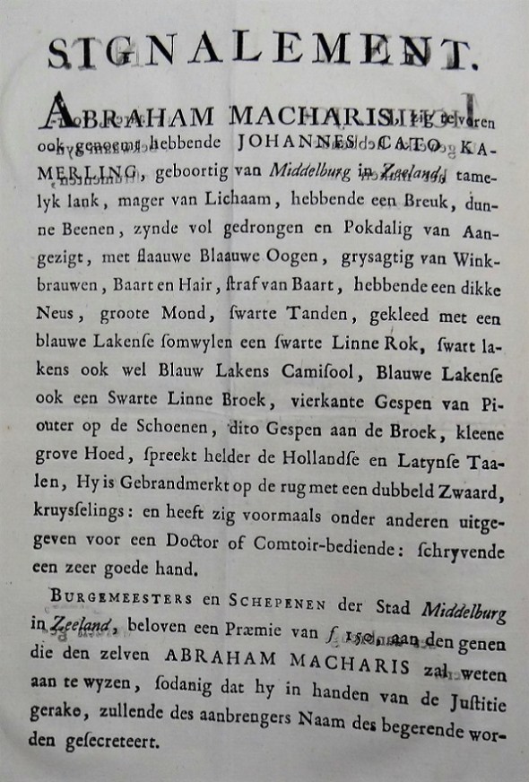 Kwam bij de ingekomen brieven van het Groninger stadsbestuur dit signalement tegen van de beruchte oplichter Maggaris, alias Jan Cato Kamerling. De man die soms voorgaf theoloog te zijn en dan weer arts, wist met zijn vrome praatjes en voorspiegelingen van zijn grote rijkdom op verschillende plaatsen, o.a. Hoogeveen (Drenthe) en Brouwershaven (Zeeland) jongejuffrouwen uit de betere kringen het hoofd op hol te brengen en zelfs tot huwelijken te verleiden. Vaak spon hij een soort van brievenweb, waarmee hij zijn pseudologica fantastica bij hun familie aannemelijk wist te maken. Volgens een van zijn biografieën moet hij ook nog een poosje in Groningen hebben gewoond. In 1769 was hij kennelijk even ontsnapt, maar wist men hem al snel weer in te rekenen.