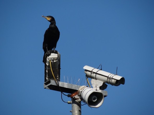 • Ik bedoel die pinnen die daar achter op die horizontale stang zitten. M.i. zijn dat de pinnen die je ook weleens op kerktorens ziet om het zitten (en daarmee zittend faecaliseren) der vogels te voorkomen, en had men dat dan hier kennelijk ook op de camera’s zelf moeten doen.