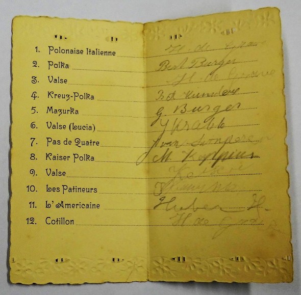 Boekjes is eigenlijk een groot woord, want het betreft dubbelgevouwen kaartjes. In dit geval waren die van een jongedame. Op de binnenkant van haar balboekje tekenden jongeheren in op de dansen van het programma: