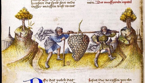 Op last van zijn Heer zond Mozes verspieders uit naar het Land van Belofte. Ze dienden daar in Kanaän bijvoorbeeld te bekijken hoe de economie er floreerde. Ook moesten ze wat producten uit dat land meenemen. Nou begon net in die tijd de wijnoogst en vandaar dat een stel van die kerels terugkwam met een tros wijndruiven, “dien zij droegen met zijn tweeën, aan een draagstok” (Numeri 13).