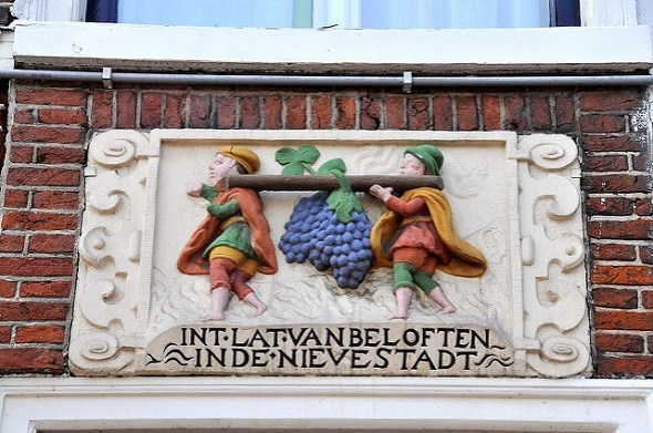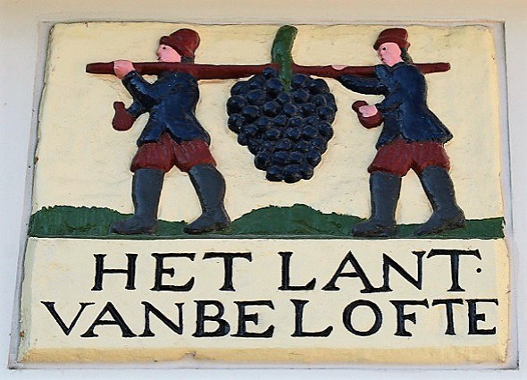 Eeuwen later noemden heel wat herbergiers in het toen nog bijbelvaste Nederland hun zaak Het Land van Belofte. Het beeldmerk lag voor de hand. Er kwam een stel kerels op de gevelsteen of het uithangbord te staan. Ze droegen een zware druiventros aan een forse staak tussen zich in.