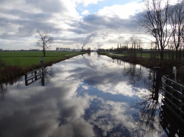 Aduarderdiep vanaf de Tichelwerkbrug naar het zuiden, met de suikerfabriek aan de horizon: