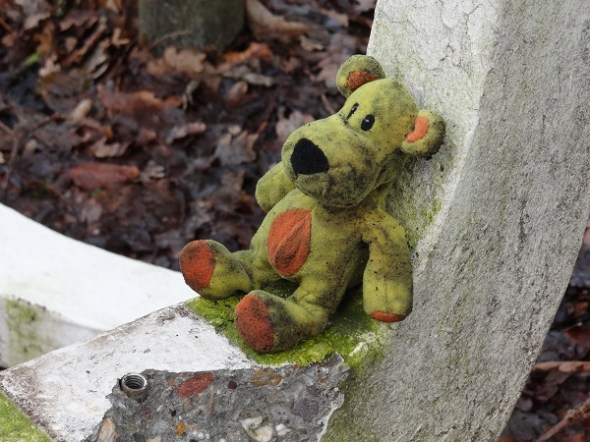 Verdrietige knuffel op een bankje bij de ingang van de Piccardthof: