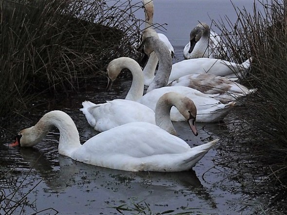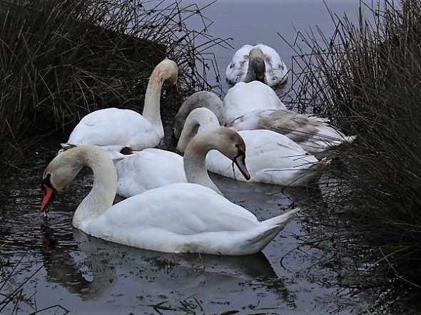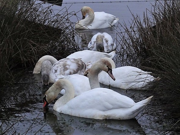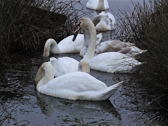 Vanochtend zien fourageren vlakbij het Hegepad: de familie zwaan die daar dit voorjaar ontstaan is. Pa en moe en de koters blijven dicht bij elkaar, in de winter. Ze trekken zich nauwelijks iets aan van passanten: