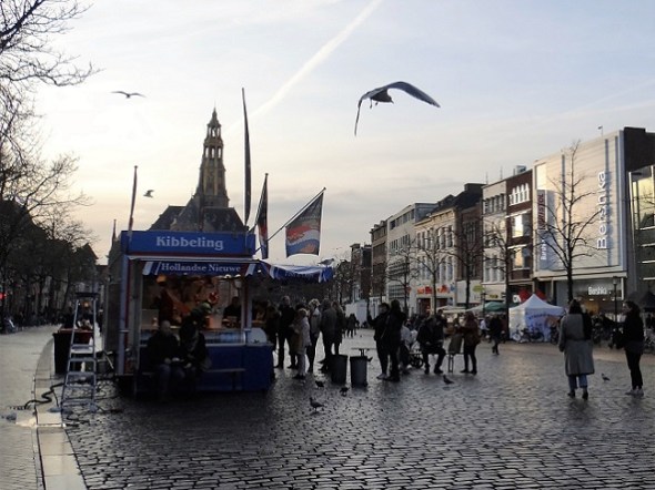 Vismarkt met haringliefhebbers van diverse pluimage: