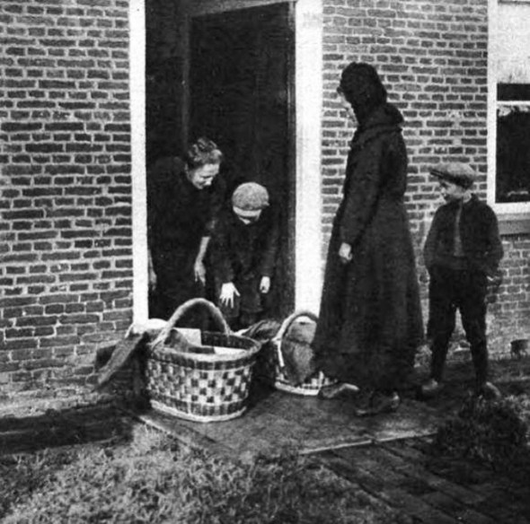 Zo ongeveer moet mijn overgrootmoeder erbij gelopen hebben, in Zuidhorn. Aardig is dat de bijbehorende conversatie ook het midwinterse assortiment in zo’n broodkorf weergeeft: