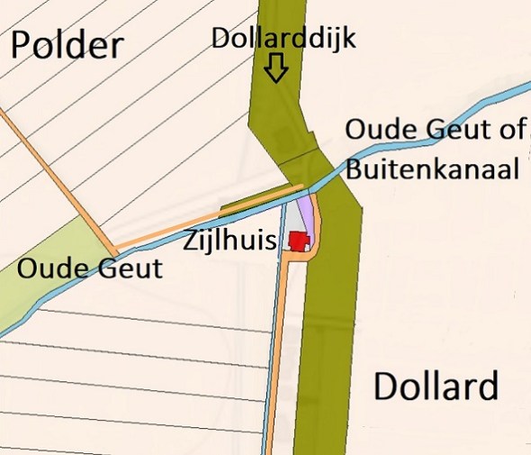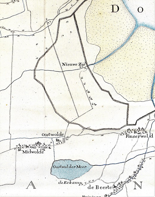 De Dollard met de Oude Geut (rechtsboven), de Oostwolderpolder met zijn zijl en Zijlhuis (midden) en Midwolda, Oostwold, Finsterwolde en Beerta (onder) op de Neue Geographische Special Charte, die de Hollandse kapitein W. Camp tussen 1798 en 1802 maakte van Oost-Friesland en omgeving.
