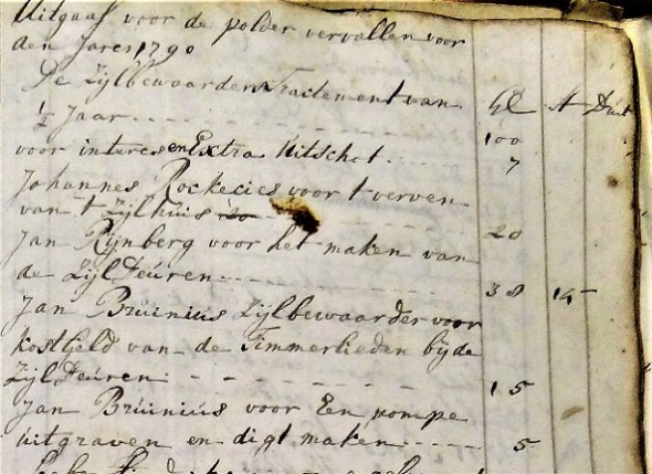 maakten, naast het uitgraven en weer bedekken van een duiker, het “dijkpeilen” en anderhalve kroes jenever, terwijl het in 1794 en 1795 ging om geld dat Brunius voorschoot voor de “zijlboll” (= het bolschip), en verdiende met het “brouwen” (breeuwen) van dezelfde “bolle“. Hoewel de polderbestuurders geen reiskosten en verteringen mochten declareren, deden ze dat na verloop van tijd toch – daarom is niet uit te sluiten dat er consumpties schuilgaan achter ongespecificeerde uitgaven.