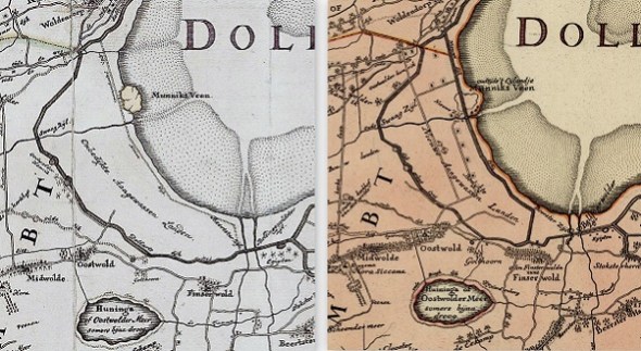 Bronnen: Reinder Reinders e.a., De atlas van Beckeringh (Zwolle 2016) pag. 70-71 (detail manuscriptkaart) en RHC Groninger Archieven 1536-631 (detail gedrukte kaart).