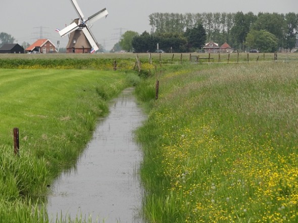 Links watermolen De Jonge Held met vlaggetjes aan de wieken vanwege de nationale molendag – rechtsachter de Gaaikemadijk: