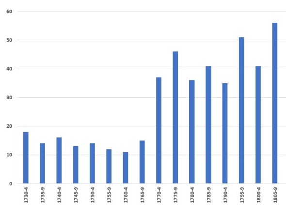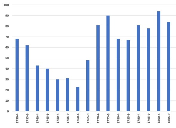 Eerst maar de huwelijken. De volgende grafiek geeft hun aantallen per vijf jaar weer over de periode 1730-1809:
