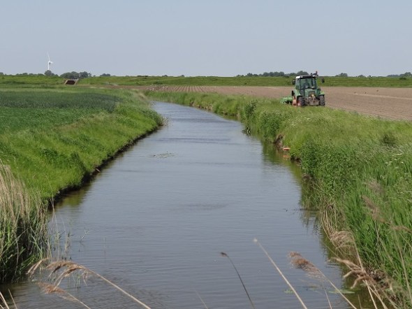 Deze Tochtsloot haaks op het Oldehoofsch Kanaal vormde ooit de kerspelgrens tussen Saaksum en Ezinge. De brede groenstrook waarop de tractor rechts het gras maait, was voor 1826 de weg van Ezinge naar Saaksum: