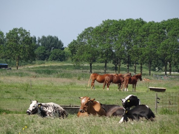 Een boer had schrikdraad door zijn land gespannen, om de koeien op één stuk te houden. En wat doen ze? Ze grazen onder de draad door. Variant op ‘buurmans gras is altijd groener’, zeg maar. Op de achtergrond de kerk van Roderwolde: