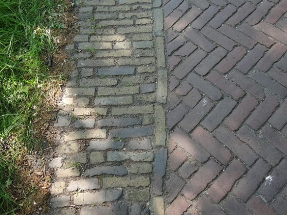 Op de flank van de weg zitten gele klinkertjes, rechttoe rechtaan gelegd, in het midden zijn rode klinkers gebruikt in een visgraatverband: