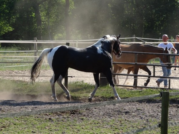 Leutingewolde – de gevlekte hengst op de voorgrond raakt van de kook als zijn baas de bruine merrie met haar veulen langs hem voert: