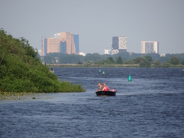 Het Leekstermeer en de skyline van de Stad vanaf een punt in de hooilanden tussen Leek en Lettelbert: