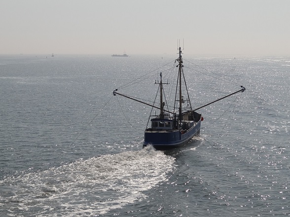 Garnalenkotter vaart vissend langs de vaargeul: