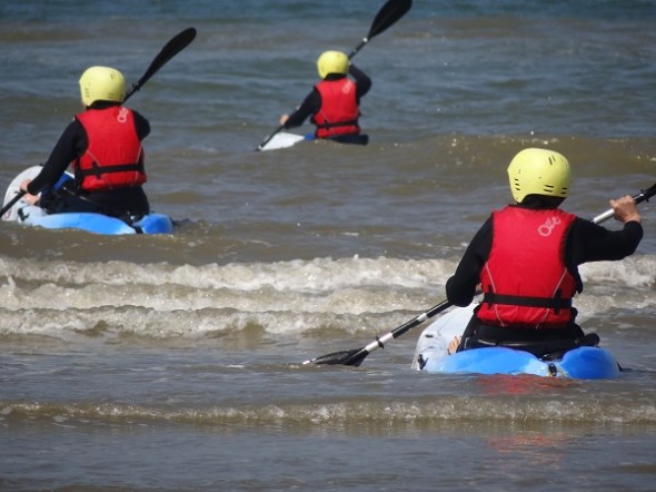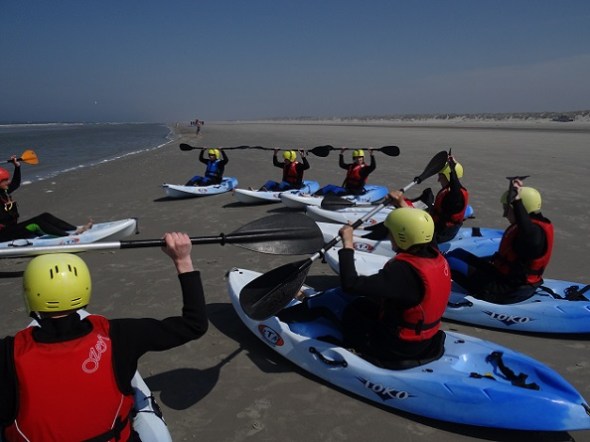 Actievelingen konden raften met een kano in de branding, waarvoor ze hier wat instructies krijgen:
