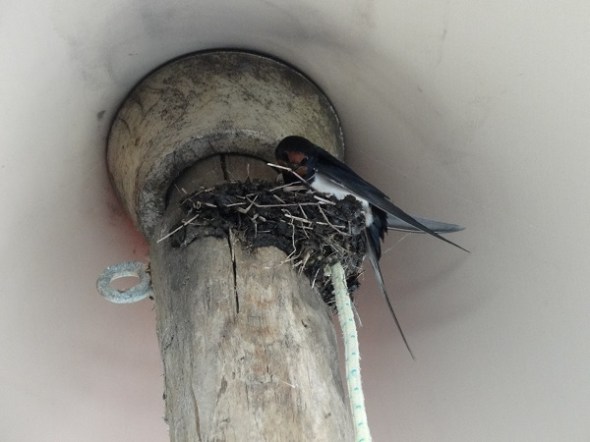 In de nok van een parasol bouwde een zwaluwenpaar intussen aan een nest: