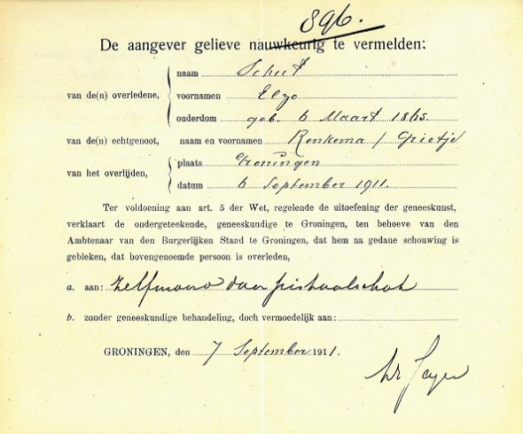 Een bron waar ik te laat aan gedacht heb, zijn de overlijdensbriefjes die voor de gemeente Groningen bewaard zijn gebleven. Deze geven doodsoorzaken op. Het briefje van Schut staat bovenaan dit stukje. De lijkschouwer noteerde: