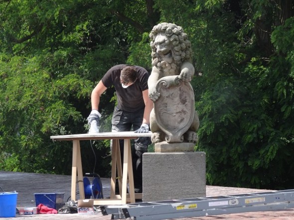 Werkzaamheden bij het Groninger Museum: hij voelde zich al die tijd al wat op de vingers gekeken (leeuw voert wapen Ripperda in zijn schild):