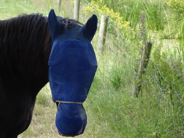 Paard met blauw masker