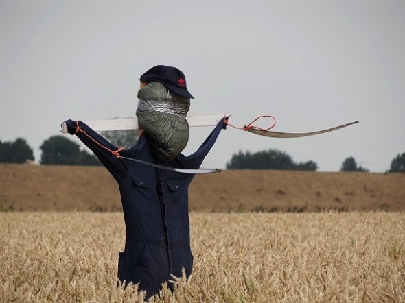 Hij bewaakt de wierde met graan – in de boom rechts nestelen duiven: