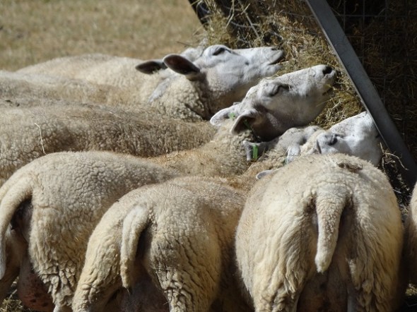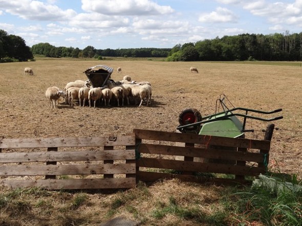 Bij de Scharenhulsedijk, zo’n beetje tegenover de Grote Velddijk, verdringen schapen zich rond een dispenser voor hooi. Hun veld, normaal groen zo vlakbij de beek, is dor en kaalgevreten:
