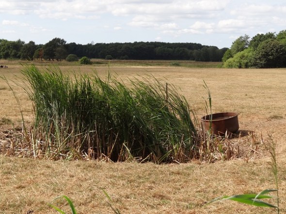 In het land zit een verdroogde drinkdobbe, waar nog wat riet in groeit. Voor zover zichtbaar zit er in die bak rechts geen water: