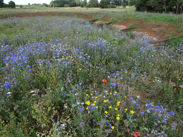 Bij de Oude Stuw is het beeld heel anders – de aanleggers van de nieuwe vispassage hebben de meanders ingezaaid met een wilde bloemenzaadmengsel, waarvan de korenbloem momenteel domineert: