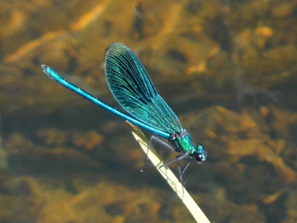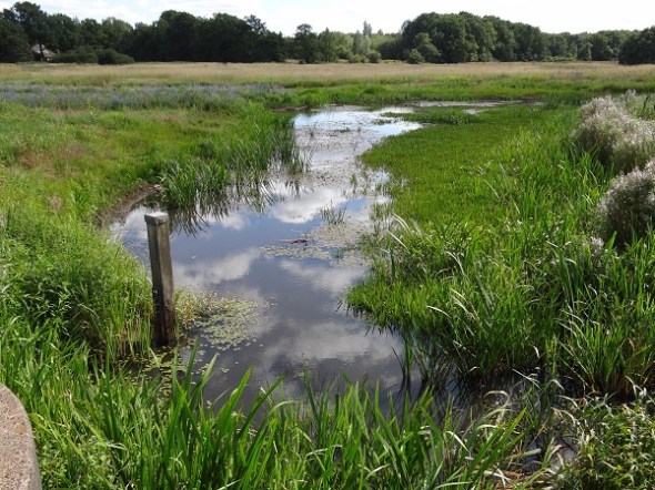 Ook hier staat nog wel water, misschien een 10 à 20 centimeter – bij de brug wemelt het van de weidebeekjuffers, die ik hier nooit eerder zag: