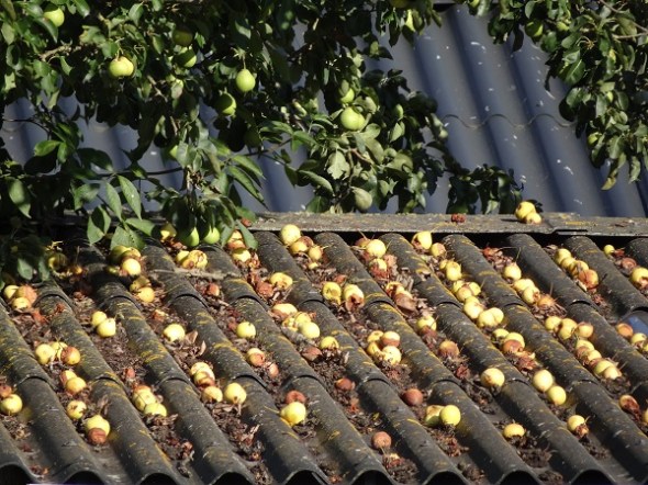 Veel fruitbomen laten vanwege de hitte hun vruchten nu al los – een dak in Foxwolde ligt bezaait met peren: