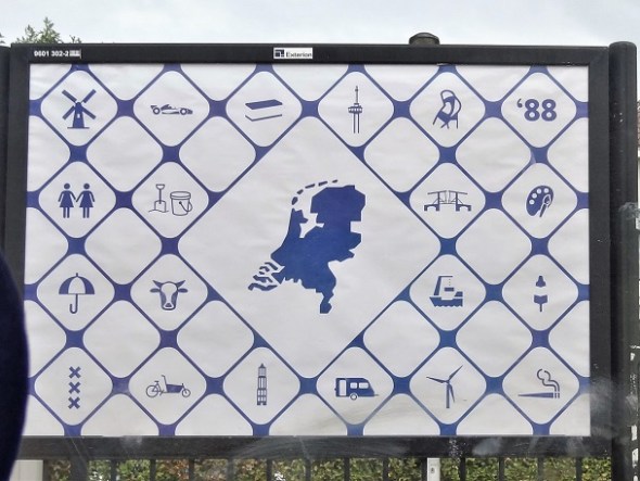 Dit billboard met pictogrammen voor zaken als molen, tompoes, koe, waterijsje, hipsterbakfiets, windturbine en joint, hing op een veenkoloniaal station, hetzij Hoogezand, hetzij Sappemeer-Oost. Kennelijk gaat het eerder om kunst dan reclame – iemand die weet wie de maker is?