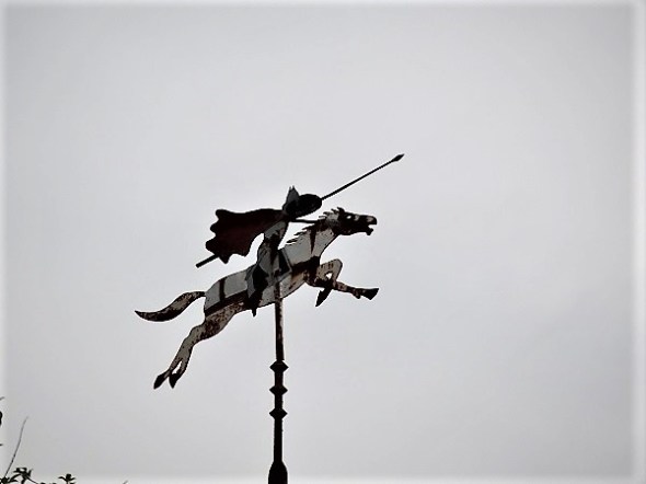 Ridder te paard met lans, als windwijzer op een villa die Schattersum heet, naar een voormalige borg in Schildwolde:
