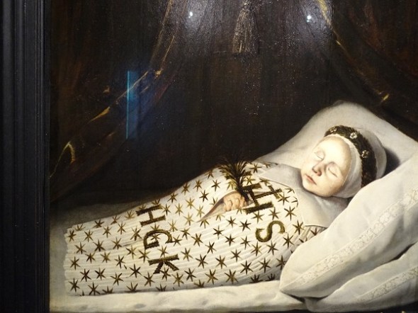 Een aandoenlijke tegenhanger is dit portret van een overleden kind door Jan Jans de Stomme uit 1654. Het meisje (?) draagt een takje rozemarijn in d’r gevouwen handjes. Op het doodskleed het anagram van Christus en mogelijk haar eigen initialen: