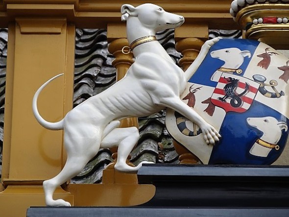 Ook nog even in de borg zelf gekeken. De hazewindhond als schildhouder boven het front blijkt duidelijk een reu: