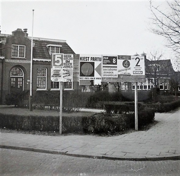 Rechts deden de protestants-christelijke partijen CHU en ARP het met wat minder papier. De eerste zei “heel het volk” te dienen, terwijl de laatste als enige aan het regionale karakter van deze verkiezing refereerde met  haar motto “Voor het welzijn van Stad en Land”. Ook toen al drukte de algemene, landelijke politiek blijkbaar een zwaar stempel op de statenverkiezingen. De VVD had ten tijde van deze opname, gemaakt door Hemmo Blaauw, nog geen plakploeg langs het bord gestuurd.